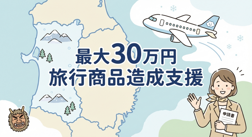 本事業は、秋田県内の2つの空港(秋田空港・大館能代空港)を利用した旅行商品を企画・販売する旅行事業者に対し、最大30万円の交付金を支援する制度です。特に冬期催行や特定路線の利用、地域鉄道の活用により支援額が加算される仕組みとなっており、インバウンドや国内団体旅行の造成に極めて有効なツールです。