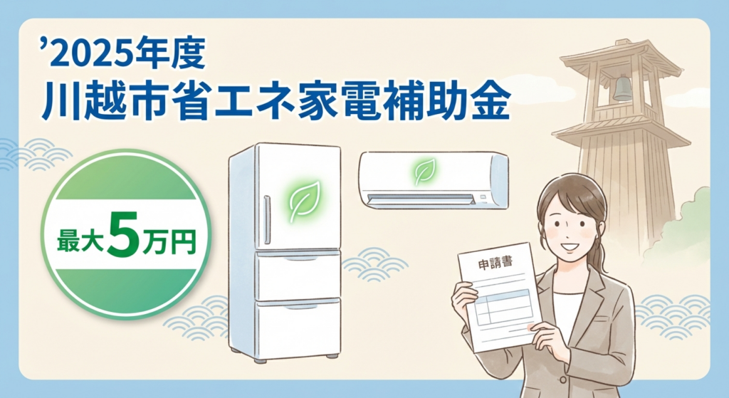 川越市では、省エネ性能の高いエアコンや冷蔵庫への買い換えに対し、最大5万円を補助しています。対象は川越市民で、税抜10万円以上の新品購入が条件となります。予算上限に達し次第終了するため、早めの申請が重要です。