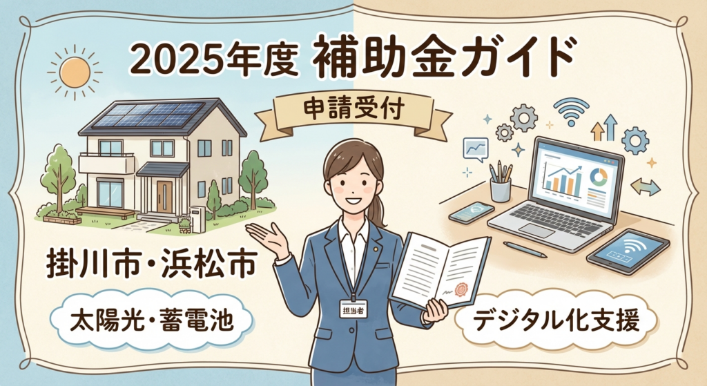 2025年度、静岡県掛川市と浜松市では、市民および事業者を対象とした強力な補助金制度が実施されています。掛川市では住宅用エネルギー設備導入に対し最大3万円、浜松市では中小事業者のデジタル化推進に対し最大30万円が補助されます。いずれも予算上限に達し次第終了となるため、早めの申請準備が不可欠です。