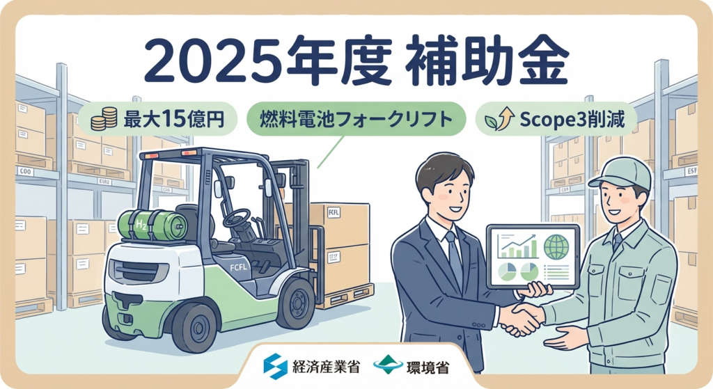 2025年度(令和7年度)の環境省「省CO2設備投資促進事業」は、サプライチェーン全体の脱炭素化(Scope3削減)を目指す企業にとって最大の支援策です。本事業では、代表企業と連携企業が協力して行う省エネ設備投資に対し、最大15億円、燃料電池フォークリフトの導入には1台あたり最大550万円が補助されます。