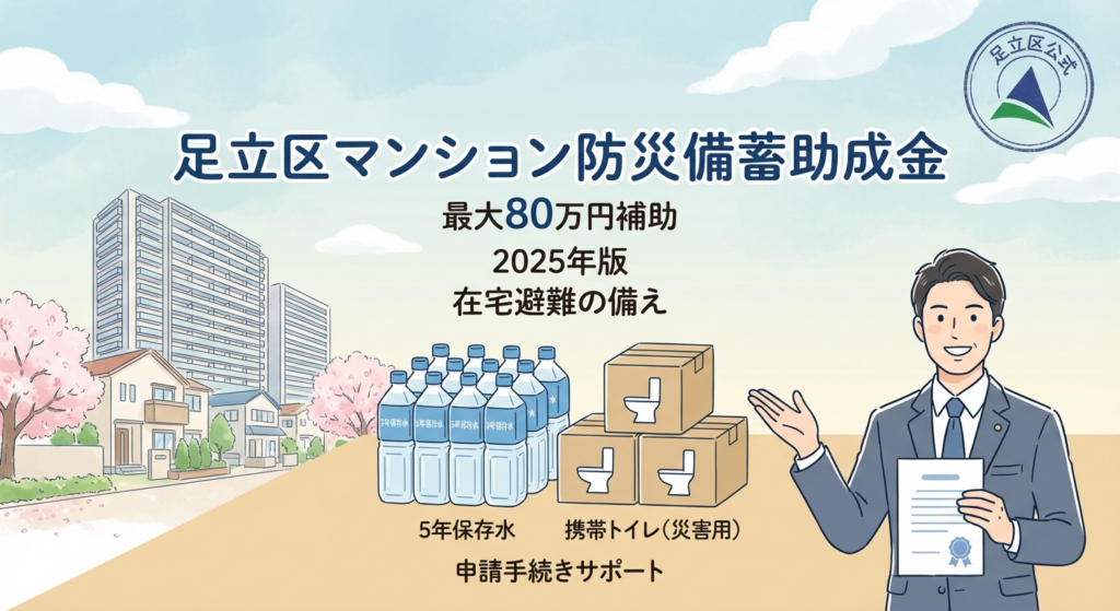 東京都足立区では、災害時の「在宅避難」を強力に推進するため、マンションの管理組合や所有者が行う防災備蓄品(保存水・携帯トイレ)の購入費用を最大80万円まで助成しています。
