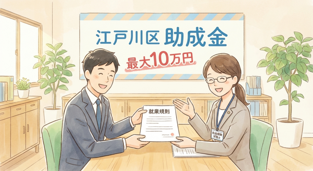 厚生労働省系の助成金(キャリアアップ助成金や両立支援等助成金など)の多くは、就業規則への規定が受給要件となっています。江戸川区の助成金を使って就業規則のベースを作っておくことで、将来的に数百万円規模の国庫助成金を受ける準備が整います。