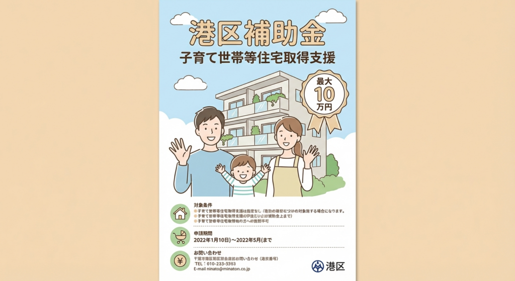 港区独自の制度ではありませんが、東京都が実施する「018サポート」や、国が実施する「子育てエコホーム支援事業」など、年度によって大型の補助金が募集されます。これらは住宅取得支援補助金と併用できるケースがほとんどです。