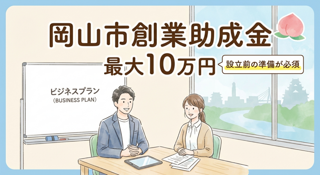 岡山市創業促進助成金は、市内で新たに株式会社等を設立する創業者に対し、最大10万円を交付する制度です。令和7年(2025年)4月1日から令和8年(2026年)3月31日までの設立が対象ですが、「設立登記前」に特定創業支援を受けることが絶対条件となっています。
