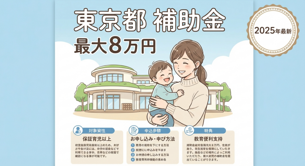 東京都内の認証保育所を利用する世帯に対し、認可保育園との保育料差額を埋める目的で最大月額8万円が助成されます。令和7年9月からは第1子無償化の動きにより、多くの区で助成額が大幅に拡充されています。